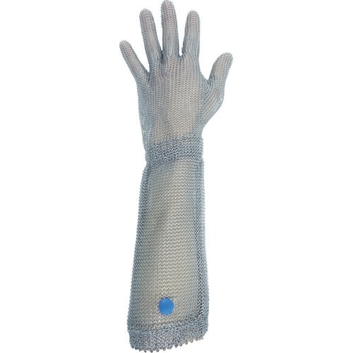 袖口も保護できるロングタイプです。抜群の耐切創強度があります。金属探知機反応タイプのステンレス製です。ステンレススプリングのリストバンドにより、衛生的でかつ抜群の耐久性があります。