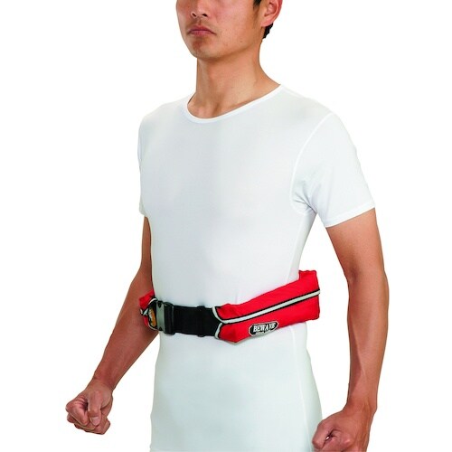 | 注意事項 | ※着用時は胴ベルトのバックルを留め、ベルトを締めてください。一度作動した炭酸ガスボンベは続けて使用する事は出来ません。交換用ボンベセット(適応品番:UMK−M17G)をご購入頂き、再装着をお願い致します。膨張時、膨らみが足りない場合は、気室(黄色布)に補助送気管(赤色のチューブ)が装着されていますので、呼気によりふくらみを足してください。 |