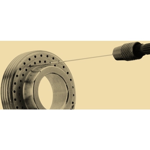回転時の遠心力によるブラシ線材の広がりを利用し、フレキシブルに加工箇所への作業を行ないます。 電着ダイヤモンドにより、効果的な交差穴のバリ取り、面取り作業が可能です。 |