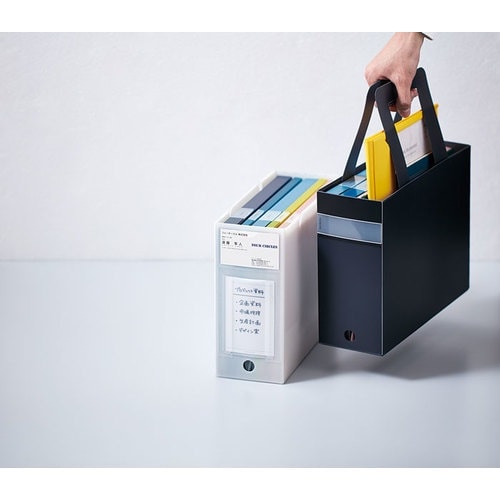 必要な時だけ引き出せる「可動式ハンドル」です。名刺が入るポケットや、見出し紙付きです。組み立て不要でしっかり自立します。ファイルや書類の整理に。