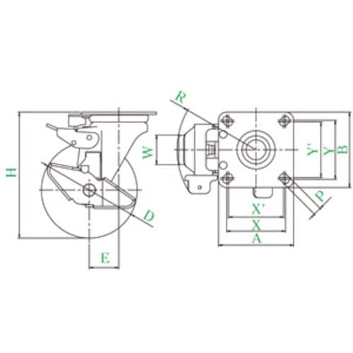 取付ピッチが自在、自在ストッパー付、固定式共に同一です。軽量で耐油性、耐摩耗性に優れたナイロンホイルウレタン車輪を使用しています。台車、ワゴンなどに。 |