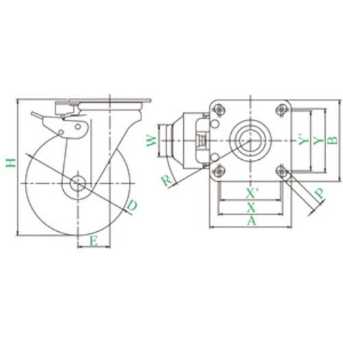 取付ピッチが自在、自在ストッパー付、固定式共に同一です。軽量で耐油性、耐摩耗性に優れたナイロンホイルウレタン車輪を使用しています。台車、ワゴンなどに。 |