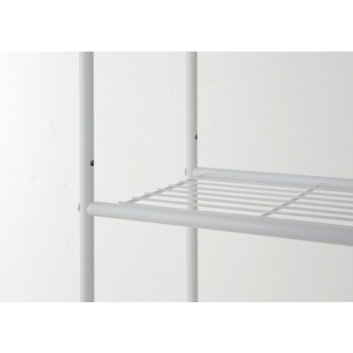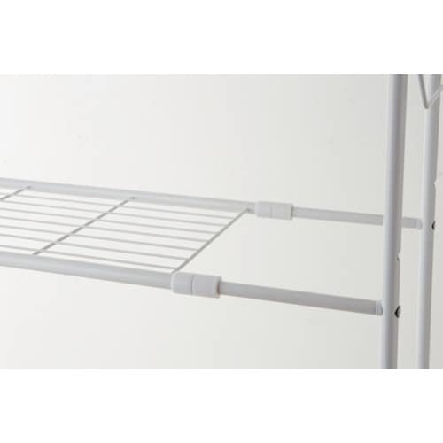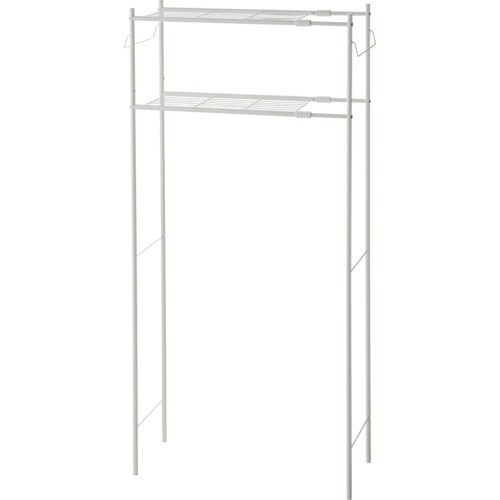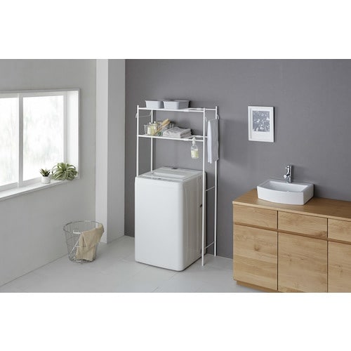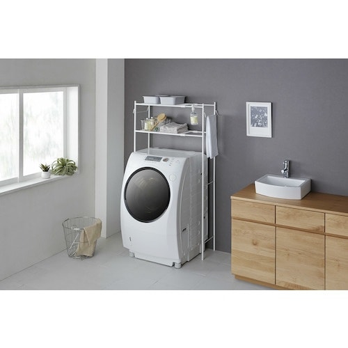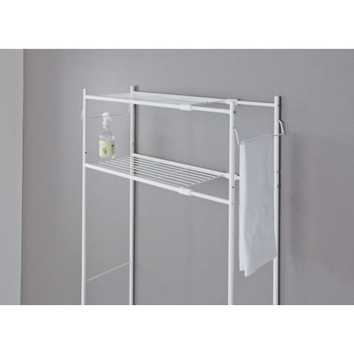 コンパクト性と機能の両立、2つのタオル掛けが付いて便利、幅は伸縮自在で洗濯機に合わせてスペースの有効活用ができる、下段の棚は高さが2段階選べます2つのタオル掛けが付いて便利です。 |