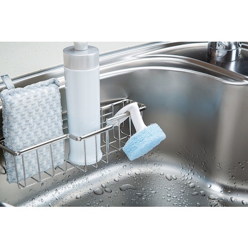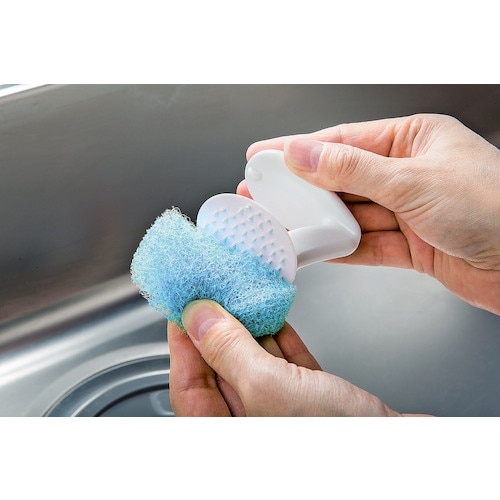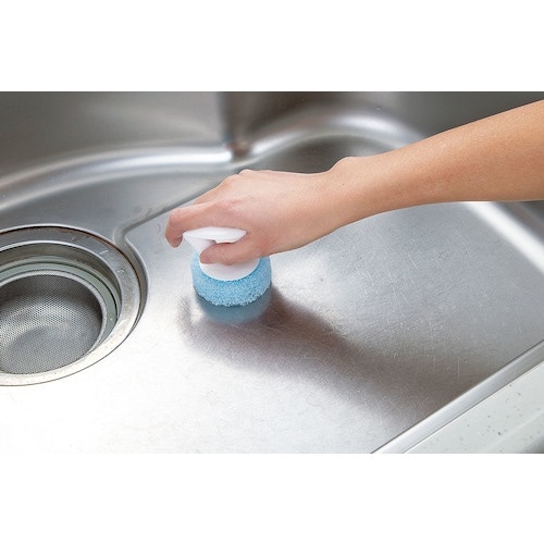 キズつけにくい丈夫な樹脂加工不織布が、水だけでシンク周りの水垢・油汚れをかき取ります。たわしは簡単に着脱でき、裏表使えます。手のひらにピタっとフィットして握りやすく、力を入れやすいグリップです。 |