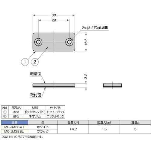 全長(mm):38 | 幅(mm):16.5 | 厚さ(mm):3.2 | 吸着力(N):14.7 | 取付ピッチ(mm):28 | 色:ブラック |…
