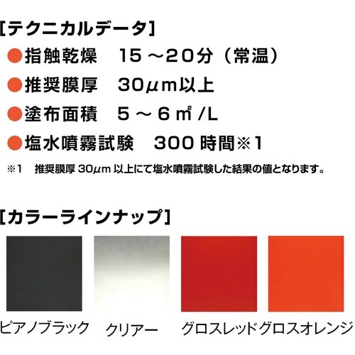 艶も錆止めも両立、下回りを美しく仕上げます。磨かれたピアノのような光沢に仕上がります。硬く膜厚のある塗膜が下回りを美しく守ります。耐チッピング性能に優れます。塩水噴霧試験300時間合格。 |