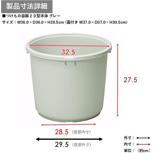 容量(L):20 | 外形寸法(mm)高さ:285 | 色:グレー | 高さ(mm):285 | 外径(mm):360 | 外形寸法(mm)外径:36…