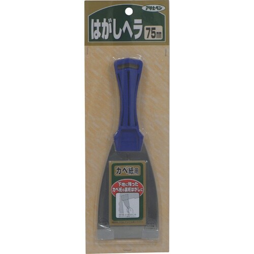 柄付きのステンレス製ヘラで、古いカベ紙をはがした後に壁面に残る裏打ち紙をスムーズにはがせます。カベ紙用裏打ち紙の除去に。 |