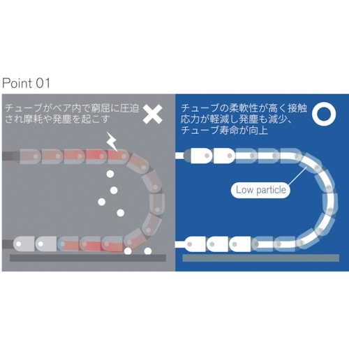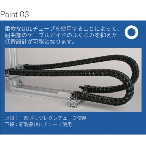 これまでのポリウレタンチューブの柔軟性をさらに向上させました。ウレタンチューブUSシリーズより柔軟性に優れUFシリーズと同等の最高使用圧力でご使用できます。 |