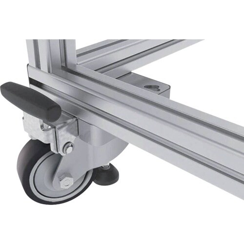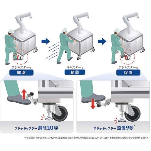 アジャスターの機能を備えたキャスターです。レバーのワンタッチ操作にてアジャスターの設置と解除が可能です。レバーが常に筐体の外側に位置しているので、固定時にキャスターを回す必要がありません。 |