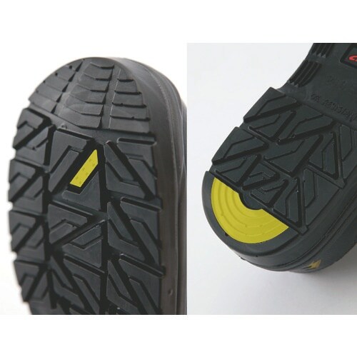 靴の取り替え時期をスリップサインでお知らせします。先芯は国際基準(ISO)200Jの樹脂先芯です。耐油底で耐滑性に優れています。屋外作業に。倉庫作業、物流作業などに。