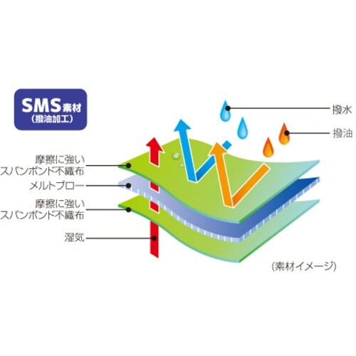 特殊撥油加工が油の浸入を防ぎます。SMS素材特有の優れた通気性と粉じんバリア性があります。ペイントスプレーや機械メンテナンスなどの油汚れ・液体汚れが発生する作業に。粉じんを伴う作業。 |