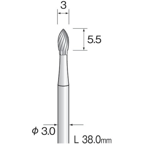 形状:スパイラルカット | 刃径(mm):3.0 | 刃長(mm):5.5 | 軸径(mm):3.0 | 全長(mm):38.0 | 最高使用回転数(…