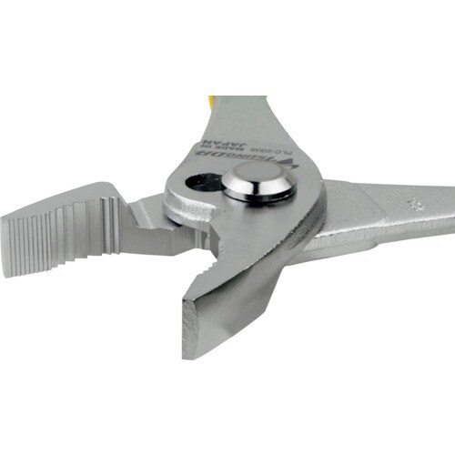 非対称形状の刃が3点で保持することで安定しガッチリと掴めます。バネ付きで連続作業での負担軽減。高耐久性のカシメ構造でガタツキにくく、薄い2段階口開き調整で大きなものも掴めます。 |