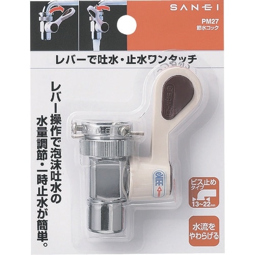 レバー操作で泡沫吐水の水量調節・一時止水します。丸吐水口径13ー22mm用のビス止め式です。 |
