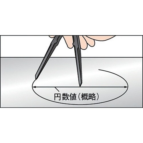 ※落下等により先端超硬部が欠ける恐れがありますのでご注意ください。測定寸法の精度保持の為、脚部の開きが硬くなっています。使用の際はマイナスドライバー等を差し込み、開いてください。使用を繰り返す間に締め付けが緩んでいきます。緩み過ぎた場合はカシメ部を叩いて締めてください。コンパスの円数値は45°開脚時の概略数値です。