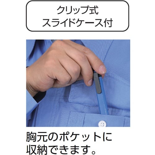 クリップ式スライドケースを採用し、安全に携帯できます。ゲージ先端をRカットしてあり安全に作業ができます。スライド方式で収納ができます。糸面取り処理をしているため、手を傷つけにくいです。 |