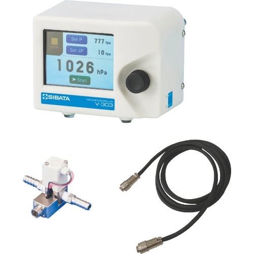 真空度を設定した値に保つためのバキュームコントローラーV−303型本体に、制御に必要な電磁弁ユニットとケーブルが付いたお得なセット品です。 |