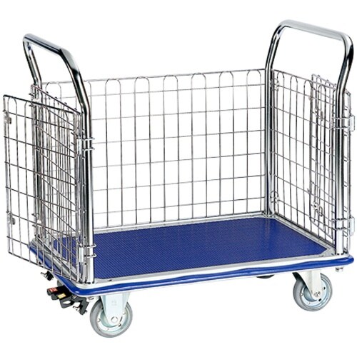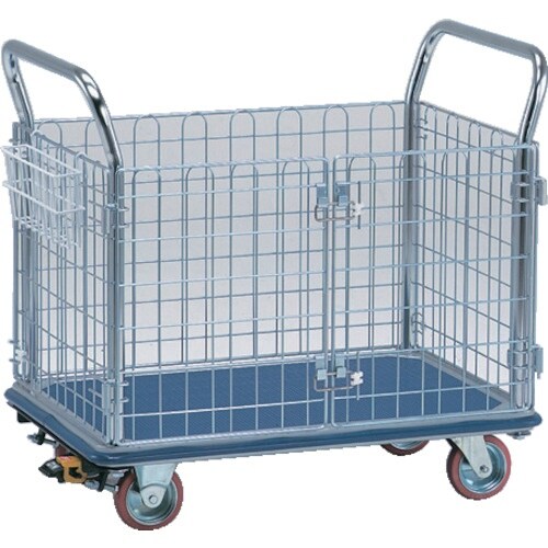 観音扉は荷台面から大きく開き、取り外し・取り付けも容易です。床面に優しい赤ブタジエンゴム車輪を使用しています。NK−307K−STはフットブレーキ付きタイプです。 |