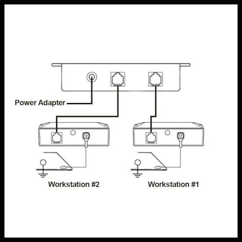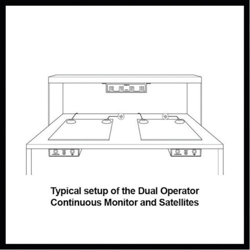 作業者2名と作業台2台用のデュアルステーション常時モニターです。作業者とESD作業台の状態を常時モニターすることで、定期的な試験と記録の手間を省きます。 |
