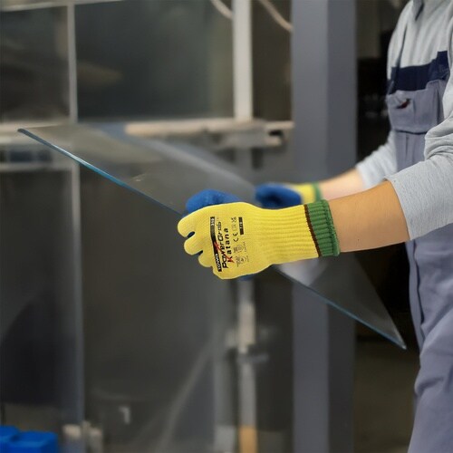 アラミド繊維と金属繊維の混合糸を採用しており、耐切創性に優れています。指紋がガラスなどにつきにくい、クリンクルすべり止め加工を施しています。倉庫作業、土木建築業。組立作業、ガラスの取扱い。 |