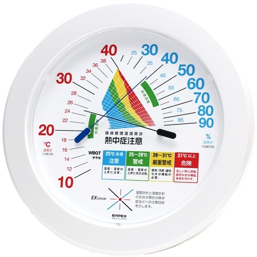 温度、湿度、熱中症注意レベルが一目でわかります。針の交差で注意レベルを表示します。大きな文字と色分け表示で遠くからでも分かりやすいです。屋内用。熱中症予防対策に。 |