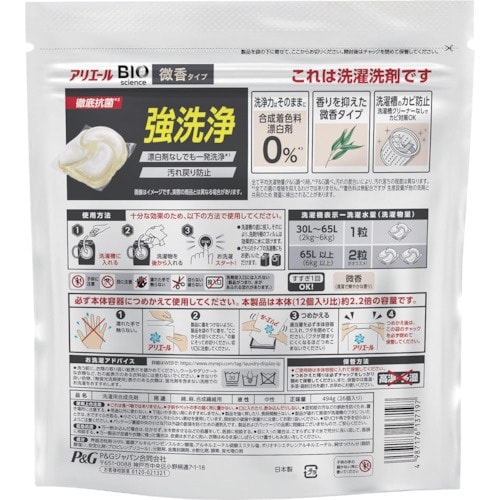 洗浄力はそのままに、アリエールフリー香りを抑えた微香タイプ、ジェルボールタイプです。すすぎ1回洗濯槽のカビ防止漂白剤なしでも一発洗浄です。汚れの度合いにより、汚れ落ちの程度は異なります。 |