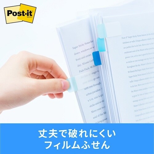 丈夫で破れにくい、フィルム素材のポスト・イット[[R上]]製品です。貼ると透明になり下の絵や文字を隠しません。1枚ずつ取り出せるポップアップ式です。しっかりとした厚みの素材で折れにくく安心です。
