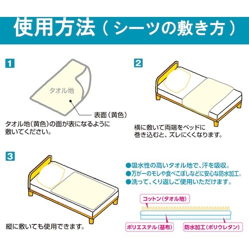 繰り返して洗って使えるタイプの介護シーツです。表面はやわらかなタオル地が汗を吸収、裏面はポリウレタン加工で水分を通しにくくなっています。ベッドサイズのみ4隅にゴムが付いています。 |