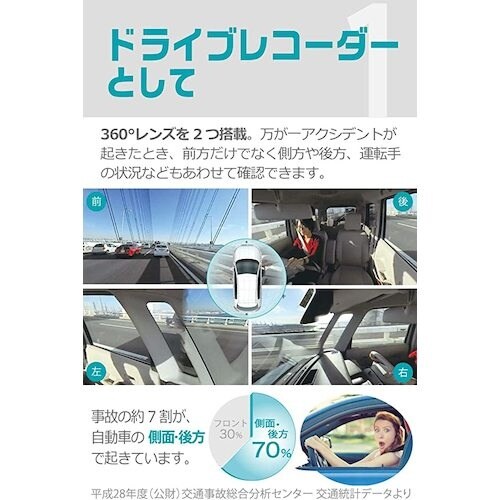 車両前方から側方、車内まで360度まるごと記録できるので、従来のドライブレコーダーでは映らなかった、あおり・幅寄せ・急な割り込みなどまで記録できます。 |