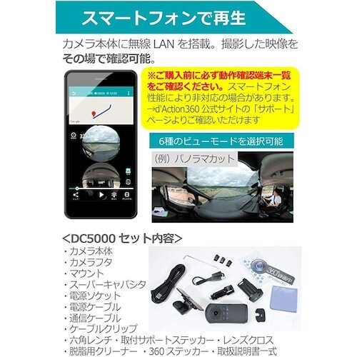 | 注意事項 | ※SDカードは付属しておりません。別売の専用microSDカード(品番:DC3/4/5)をお求め下さい。記録された映像を再生するには、対応したスマートフォン またはパソコンが必要です。車両キースイッチをOFFにしてもアクセサリー電源がOFFにならない車では使用できません。本製品は防じん、防水仕様ではありません。 |