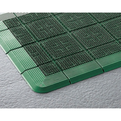 マット部の強度を高め型くずれを防止します。カートや車椅子も容易に通行できます。コシの強い芝が泥や砂をしっかり取り除きます。土砂が多い作業現場や出入口用に。 |