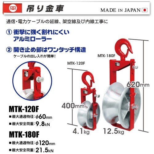 アルミローラーは衝撃に強く割れにくい合金を使用しています。開き止め部はワンタッチ構造でケーブルの出し入れが簡単です。通信、電力ケーブルの延線に。架空線および内線工事用に。 |