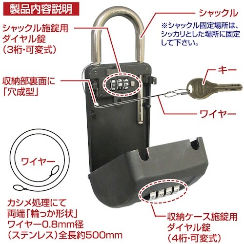 2箇所のダイヤル(Wダイヤル)でキーの管理&キーボックス自身の盗難防止が可能です。付属のワイヤーを使用する事で、「キーの持ち出し防止」を実現しキーの不正複製を防ぎます。 |