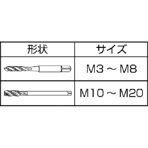 溝がねじれているので小さいカール状の連続した切りくずを後方に排出し、切りくず詰まりを起こしませんので止り穴加工に最適です。切れ味が良いため、特に粘い被加工材やプラスチック等のねじ立てに最適です。 |
