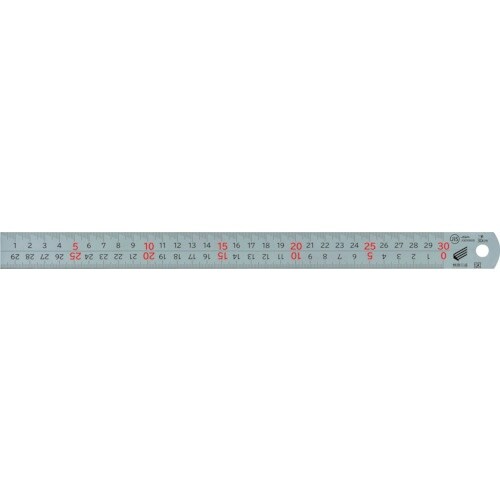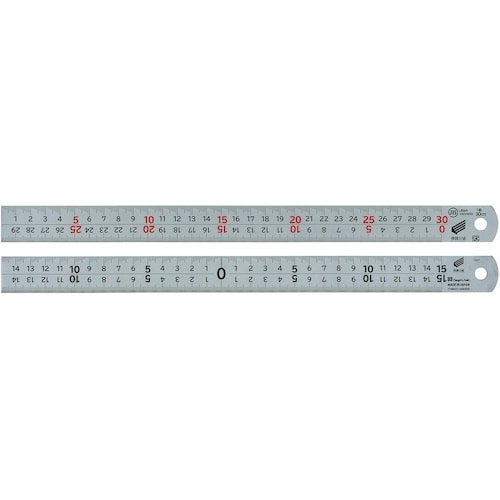 1mm単位の目盛が見やすい階段状目盛です。両面目盛付です。表面目盛は上下段ともに左基点です。裏面は中央基点目盛付です。0.5mmピッチ目盛採用で、より細かな作業に適しています。 |