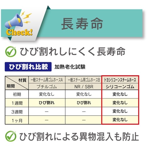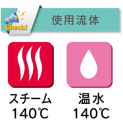 流体はスチーム(蒸気)と高温水です。従来のスチームホースの重量が1/2で軽く柔らかく、ひび割れしにくく長期間使用できます。低臭でゴム臭もなく、不快感が軽減できます。 |