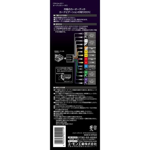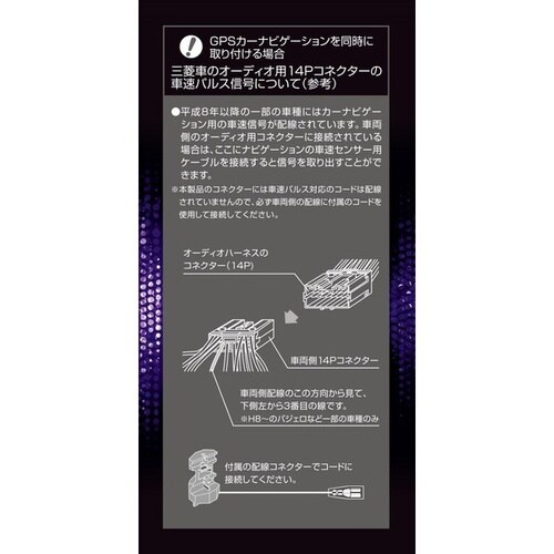 市販のオーディオデッキ取付に対応した三菱車用の変換コードです。アンテナコントロール用の平型端子付きで、他の機器接続に便利なサブ電源も備えています。 |