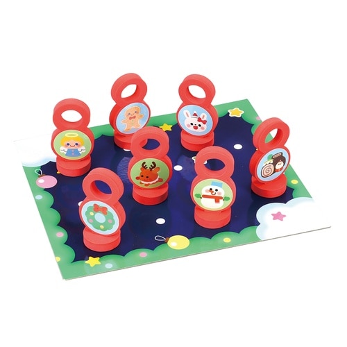 サンタさんのソリの先端につけた釣り輪で、クリスマスのキャラクターを釣り上げるゲームです。やわらかく軽いEVA素材のおもちゃです。各パーツに付属のシールを貼ってデコレーションできます。 |