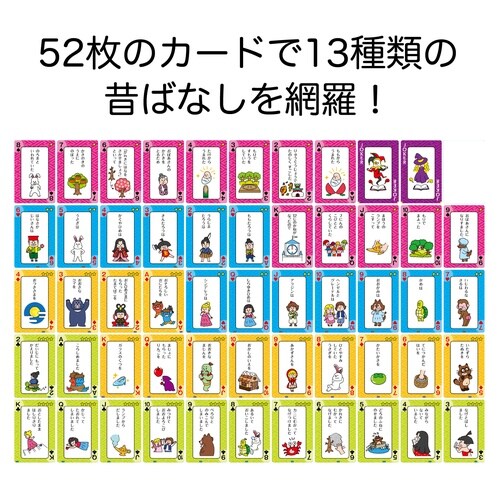 昔話のストーリーが書かれたトランプを並べて、へんてこなお話を作るカードゲームです。 |