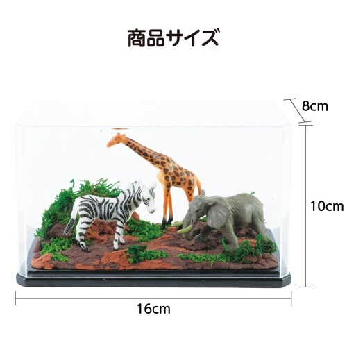 ディスプレイケース付きでそのまま飾れる、本格的なアニマルジオラマキットです。必要な粘土やフィギュアがすべて揃っており、パーツを自由に配置して自分だけのアニマルワールドを作り上げることが可能です。 |