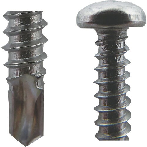 抜群の施工性、優れた締結力です。1.6ー3.2mm厚まで下穴なしで鉄板にねじ込めます。ナベ頭の特徴:なべ底形の頭部で、冷間成形性がよく、十字穴付です。ドリルねじでは最も一般的です。