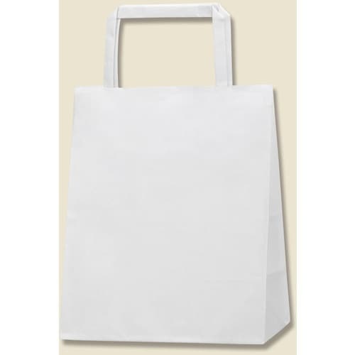もっとも汎用性の高い、プレーンな白無地の手提げ袋です。25チャームバッグの中で、正面巾が最小の規格のひとつです。表面に艶のない、晒クラフト紙を使用しております。紐は外に出た状態で包装してあります。 |