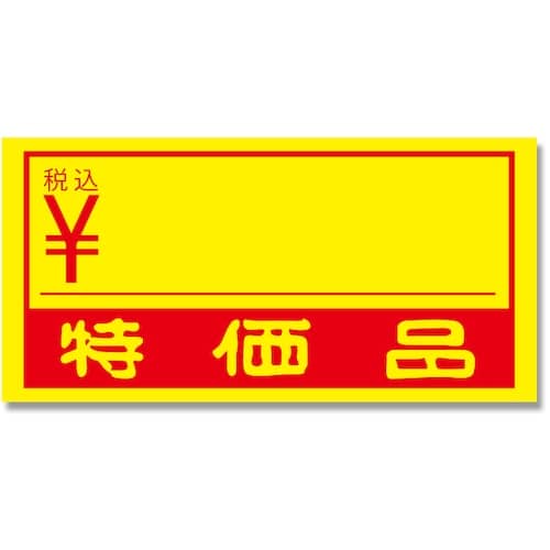 昔ながらの特価品用ラベルです。空きスペースに価格を書き込んで使用します。黄色い紙に赤のデザインで視認性が良い配色です。 |