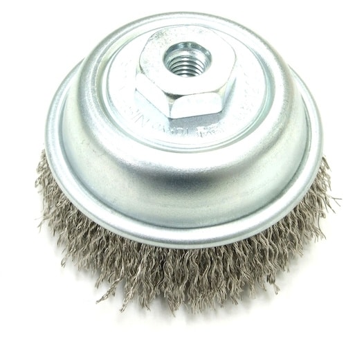 ディスクグラインダ―に取り付けて使用するブラシで、毛先が下方を向いており、平面・外角部・出っ張り部の加工に適したブラシです。 |