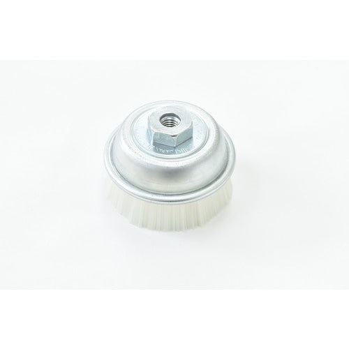 ディスクグラインダ―に取り付けて使用するブラシで、毛先が下方を向いており、平面・外角部・出っ張り部の加工に適した飛散抑制ゴム付ブラシです。 |