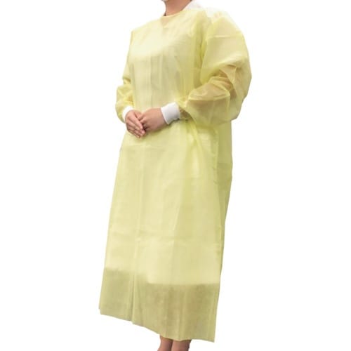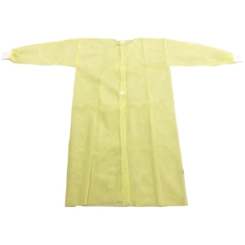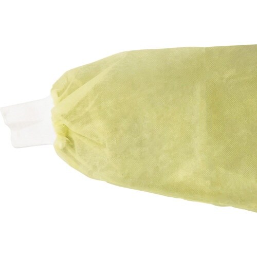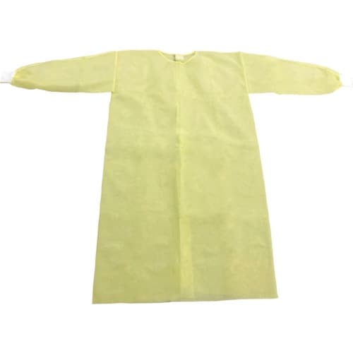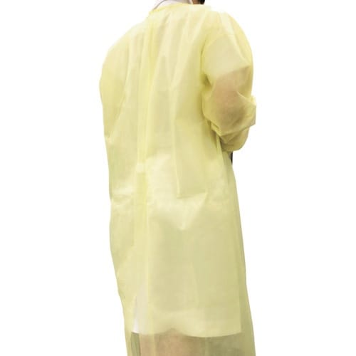 静電防止加工済のアイソレーションガウンです。初期撥水性に優れた素材(ポリプロピレン不織布)を使用しています。面ファスナー留めタイプです。首元と背部が容易に着脱できます。袖口はメリヤスゴムです。 |