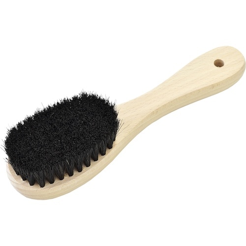 適度に短い柄にすることで、しっかり握れ、ブラッシングの強弱が自在にできる手元作業用で毛量多めの動物毛ブラシで、研磨・汚れ落とし等の様々な作業に適しています。