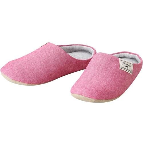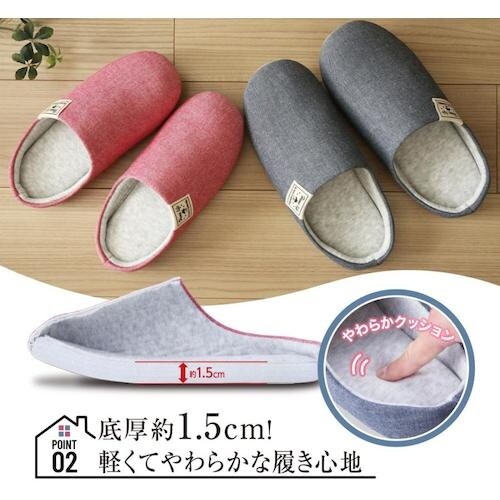 つま先上がりで小さな段差につまづきにくい。底厚約1.5cm、軽くてやわらかな履き心地です。おしゃれなシャンブレー生地です。かかと部は浅く包み込む形状で脱ぎ履きしやすい。 |