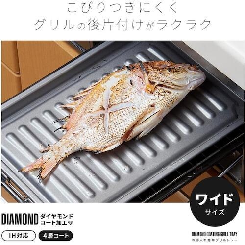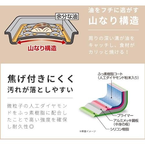 いろんなグリル調理に大活躍です。油が下に落ちないのでグリルが汚れにくく、面倒なグリルの後片付けがラクラクです。山なり構造で余分な油をフチへ逃がすので、食材がカリッと焼けます。 |